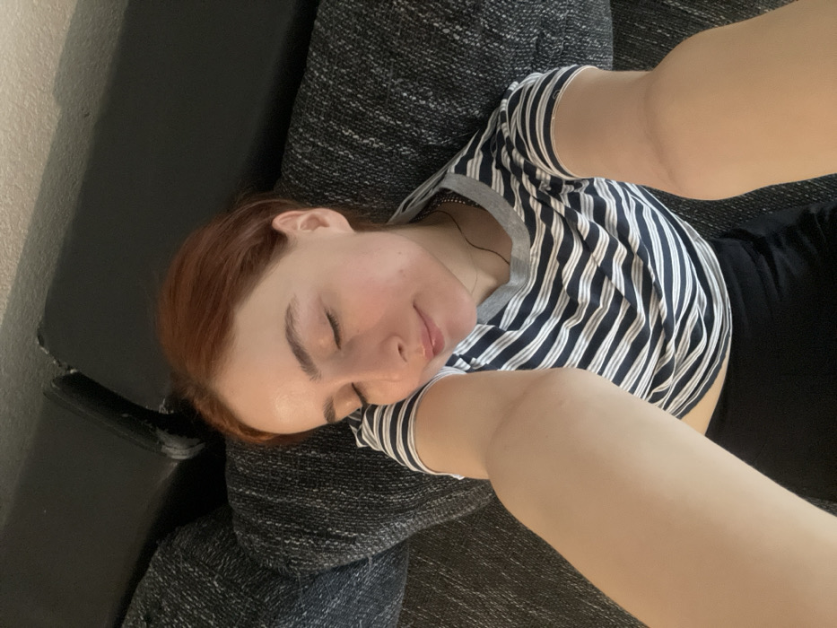 - "The image is a close-up selfie depicting a young woman with reddish-brown hair lying on a sofa in an indoor setting" by FM-iVf172, licensed under CC BY 4.0