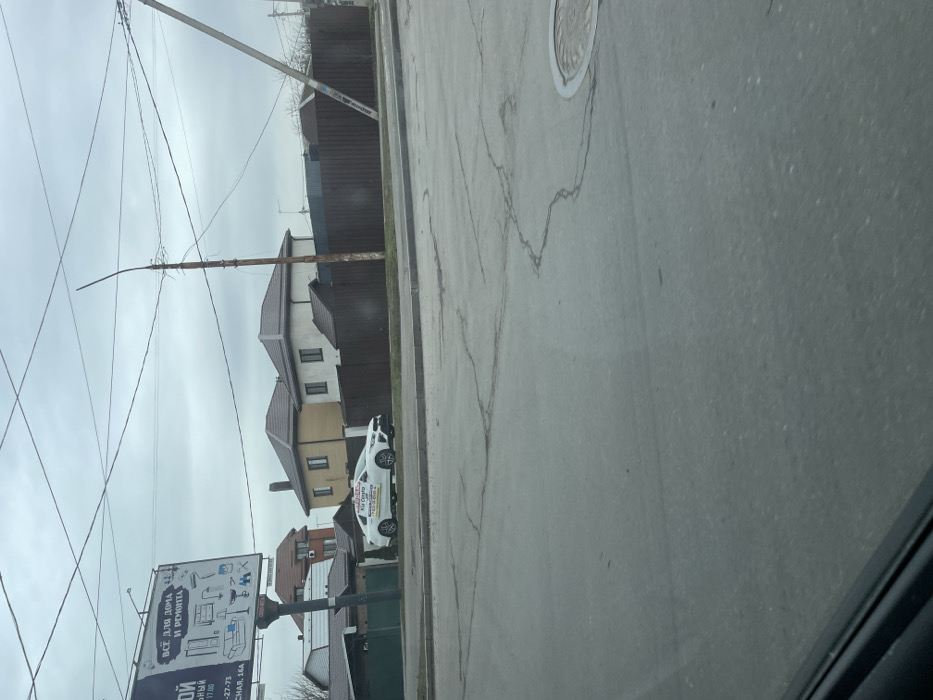 The image depicts an exterior view of a street in Rostov-on-Don, Russia, identified by visible signage as being near Tachar, 16A. The sky is uniformly overcast and light grey. In the immediate foreground, the dark lower frame of a vehicle's window is visible, suggesting the photograph was taken from inside a vehicle. The road surface is grey asphalt, characterized by numerous surface cracks and a circular metal manhole cover positioned on the right side. On the left side of the road, a large billboard with a blue background is prominent, displaying the Russian text "ВСЁ ДЛЯ ДОМА И РЕМОНТА" (Everything for Home and Repair), contact information "+7 (863) 27-72-73," and the address "ТАЧАР, 16А." Below the billboard, a white four-door Kia Cerato sedan is parked on an unpaved strip alongside the road. This vehicle is marked as an "АВТОШКОЛА" (Driving School) with a roof-mounted sign and text on its side, including the phone number "+7 (863) 24-00-40." Behind the billboard and the parked car, a dark green fence precedes several residential houses with pitched, tiled roofs of varying brown hues and light-colored walls. On the right side of the scene, a continuous brown corrugated metal fence runs parallel to the road, demarcating property boundaries. Beyond this fence, multiple residential houses are visible, featuring brown tiled roofs and light-colored walls. Two utility poles are present: a tall, thin wooden pole with exposed wood and numerous overhead wires, and a concrete utility pole positioned further right, notably leaning, also supporting wires. No individuals are visible within the frame.