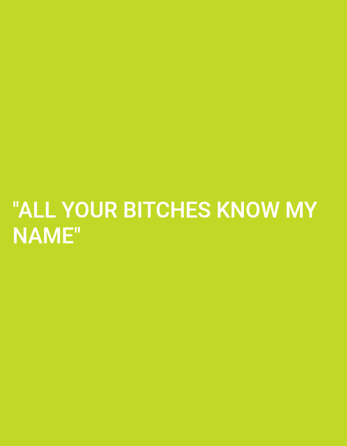 The image displays a solid, uniform lime-green background. White, capitalized text is positioned in the lower-left quadrant, enclosed within quotation marks, stating: "ALL YOUR BITCHES KNOW MY NAME". No discernible people, subjects, objects, actions, or environmental features are depicted. The image does not contain visual information to determine a specific location within the city of Парэчча, Belarus.