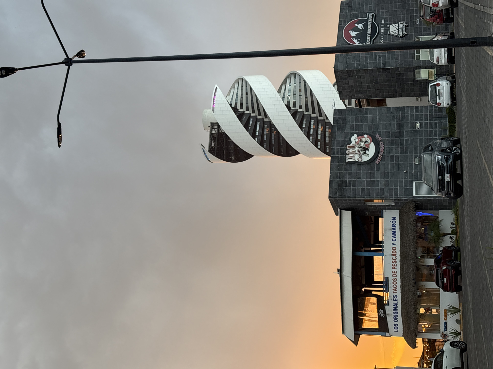 An outdoor scene captured at dusk in San Bernardino Tlaxcalancingo, Mexico, displays a distinctive urban landscape under a sky transitioning from overcast gray to a warm orange-yellow gradient at the horizon. The central focal point is the Torre Natyvo, a tall, modern high-rise building characterized by a striking white helical structure spiraling upward around a dark central core. Pink-purple lighting is visible near the top of this building. In the mid-ground, a multi-part commercial complex occupies the lower frame. To the left, a two-story building features a thatched roof section on its lower level. A sign on this building reads "LOS ORIGINALES TACOS DE PESCADO Y CAMARÓN," with "TACO Cabo" also visible. To the right, two adjacent, dark-colored, blocky commercial structures with textured facades are present. The left-most of these displays a circular "TACO Cabo RESTAURANT BAR" logo, while the right structure features "ROCKY MOUNTAIN LOVE THE RIDE" and "SUMMIT CYCLERY" logos. A dark, multi-armed street light pole stands prominently on the far right, with some of its LED fixtures illuminated. A paved parking lot with dark pavers extends across the foreground, where multiple vehicles are parked. These include a white SUV partially visible on the far left, a dark red SUV, and a dark gray Volkswagen SUV in the left-center, followed by a white compact car, a light-colored sedan, and a red SUV equipped with a bike rack further to the right. The environment is orderly, indicating a commercial area.