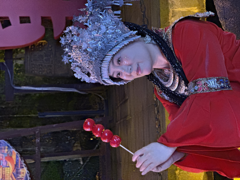 An adult female is depicted centrally in a nighttime setting, identified as Yuzhong District, China. She wears elaborate traditional attire, consisting of a prominent silver-colored headdress featuring intricate floral and leaf designs with cascading elements. Her hair is styled in dark braids, partially visible. She is dressed in a vibrant red robe with wide sleeves, its cuffs and collar intricately adorned with gold embroidery and embedded multi-colored accents resembling gemstones. A multi-layered, silver-toned neckpiece is visible around her throat. Her face exhibits makeup, including subtle shimmering particles on her cheeks and glossy lips, and she gazes slightly to her right with a faint smile. She holds a skewer bearing five bright red, glossy, spherical objects, consistent with candied hawthorn berries, with both hands positioned beneath. The background is dimly illuminated by artificial light, revealing dark, robust architectural structures, sparse dark foliage, and blurred illuminated elements, including a large red shape with discernible Chinese characters to the right.