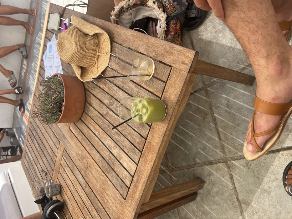The image presents a detailed view of an outdoor table scene at a cafe or similar establishment in Antiparos, Greece. A rectangular wooden slatted table occupies the majority of the frame. On the table, from left to right, are: a pair of black over-ear headphones, a small clear glass, a small grey cylindrical container, a terracotta pot holding a green succulent plant (likely a Haworthia species), a crumpled light-colored straw sun hat, a white paper menu with light blue text and graphics, a small light-colored pouch, a tall clear glass containing a light green iced beverage (consistent with a matcha latte) with two black straws, and a second, mostly empty clear glass with residual ice and one black straw. The floor beneath the table is composed of light-colored, possibly stone or ceramic, square tiles. Prominent parallel shadows are cast across the floor, indicative of direct overhead sunlight passing through a slatted structure. In the immediate foreground, the right foot of a person wearing a light brown leather toe-loop sandal is visible, along with the toes and partial foot of another person wearing dark open-toed sandals. In the background, behind the table, the lower legs and feet of at least three additional individuals are visible, suggesting multiple occupants at the table. Their footwear includes black slides, light blue open-toed sandals, and light pink flip-flops. To the right of the table, a patterned fabric bag, possibly a tote or beach bag, is partially visible on the floor, next to a dark, open-toed sandal. A white wall or building surface forms the distant background. The scene depicts a casual gathering in a sunlit outdoor environment.