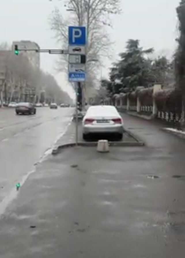 street scene in a city during a light snowfall. The street is wet, and cars are driving by. There are buildings on either side of the street and bare trees. A parking sign is visible on a lamppost. The camera then pans to a parking area with a parked car covered in snow and then to a gate leading into a snowy park. Snow is visible on the trees and grounds inside the gate.
