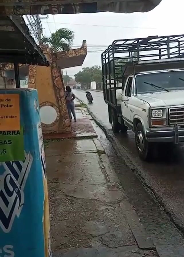 street scene on a rainy day. A white Ford pickup truck with a black cage frame on the back is parked on the side of the street. A woman wearing a light gray shirt and jeans stands next to a wall with a circular decoration. Another individual is on a motorcycle further down the street. A light blue advertisement board is in the foreground. Buildings and trees are visible in the background, with a cloudy sky overhead. Another white car is parked behind the truck. The camera moves slightly, showing more of the surrounding houses and street.