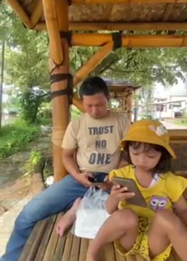 A man and a young child sit on a bamboo bench inside a small bamboo structure, possibly a gazebo or covered seating area. The man, wearing a t-shirt with the words "TRUST NO ONE" and blue jeans, is looking at his phone. A clear plastic bag sits next to him. The child, wearing a yellow shirt and bucket hat, is also looking at a phone. Both the man and child are barefoot. The structure is situated near a body of water with green vegetation and trees. In the background, there is a building and possibly other structures or houses. The sky is overcast.
