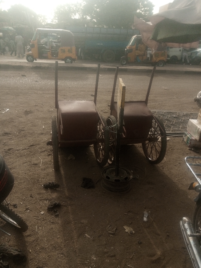 The image depicts a daytime street scene in Kofar Ruwa, Nigeria. In the immediate foreground, two dark red, two-wheeled handcarts with metal frames are positioned on unpaved dirt ground, oriented away from the camera. Between them, a vertical metal pole with an attached yellow rectangular sign is stabilized by a black metal car wheel rim at its base, with a small black tire and chain leaning against it. Partial views of two motorcycles flank the foreground: a front wheel and tire on the far left, and a chrome exhaust pipe and frame on the far right. The ground is dirt, containing scattered debris and dark clumps. In the midground, a roadway runs horizontally, hosting vehicular and pedestrian traffic. Multiple yellow and black 'Keke Napep' auto-rickshaws are present; one prominent tricycle displays "TNA 4912" on its rear. A large blue flatbed truck is visible behind the tricycles. Pedestrians, some wearing light-colored traditional garments, are walking on the left side of the road. The background shows indistinct structures and sparse trees under a hazy sky.