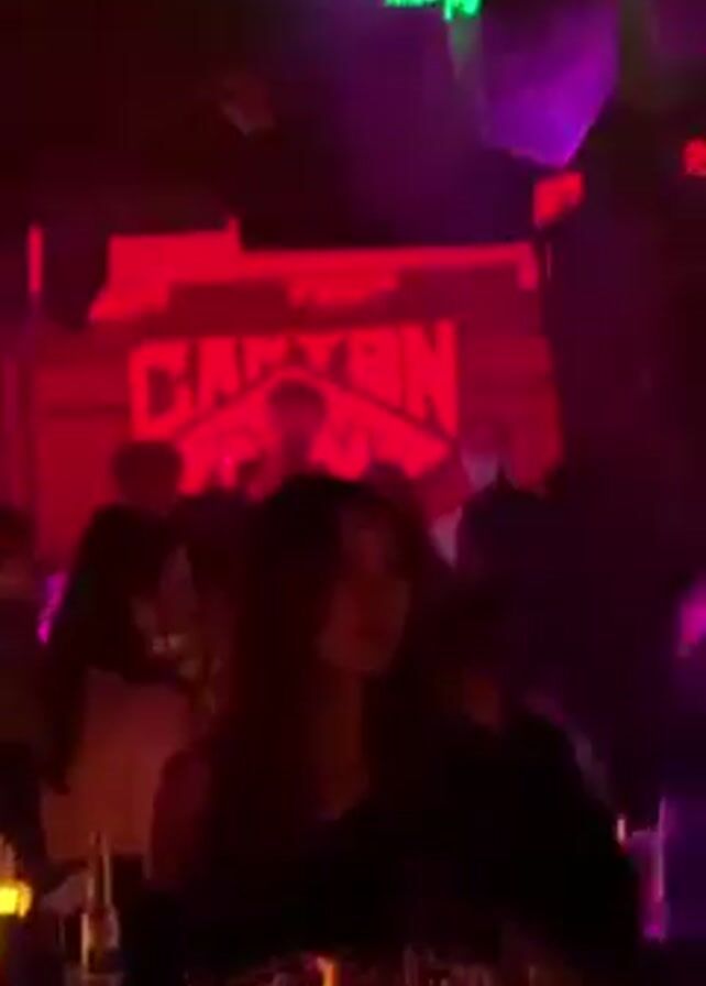 crowded nightclub or bar with people milling around. The lighting is mostly red, with some purple and green accents, creating a lively atmosphere. There are people standing around small tables on top of barrels, each table holding several drinks. In the background, there's a sign that says "Canyon". A woman with long dark hair stands near one of the tables, looking at something out of frame. The place is buzzing with energy, and the music is loud enough to make it hard to hear what's happening.