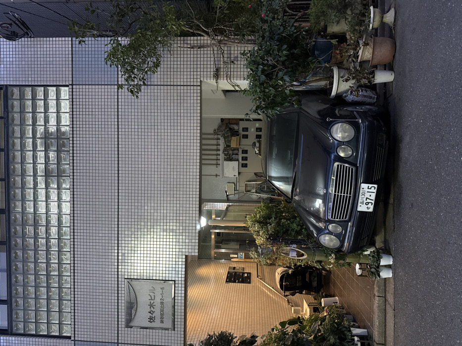 The image displays the street-level view of a multi-story building located at Shibuya-ku, Tomigaya 2-1-5, Shibuya, Japan. A rectangular plaque on the building's light-colored, square-tiled facade displays the Japanese text "佐々木ビル" (Sasaki Building) and the address "渋谷区富ヶ谷 2-1-5." The building's upper section is characterized by a large grid of illuminated glass block windows. A dark blue Mercedes-Benz sedan (E-Class W210 model) is parked with its front on the asphalt street and its rear on the paved sidewalk, partially entering a recessed ground-floor alcove. The vehicle's license plate reads 品川 301, せ 97-15. Numerous potted plants of varying sizes and species are arranged densely around the front of the vehicle and within the recessed area. To the left within the recess, a paved walkway leads to an interior building entrance with stairs, where a dark-colored baby stroller is positioned. To the right, storage shelves containing various objects and a leaning ladder are visible. The scene is illuminated by artificial light sources. No individuals are present.