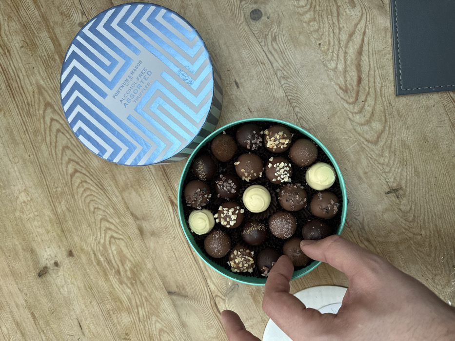 - "A partially opened round box of assorted chocolate truffles sits on a wooden floor" by FM-o3SHn1, licensed under CC BY 4.0
