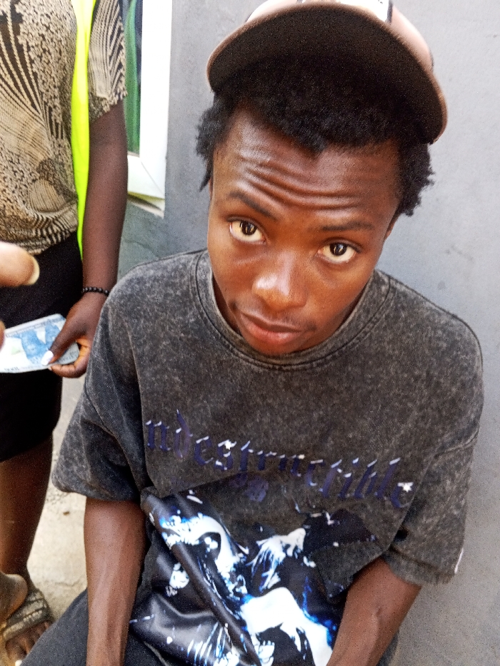 The scene, set in Akwanga, Nigeria, features two visible individuals and a partial view of a third. A young male with dark skin and short, dark curly hair, wearing a brown baseball cap backwards and a faded dark grey t-shirt with a white and blue graphic design and partial text, is positioned in the foreground, looking directly at the camera. He appears to be leaning against a plain light grey wall. To his left, another individual is partially visible, wearing a patterned top and a bright yellow vest. This person's left hand is holding a stack of blue and white Nigerian Naira banknotes. A finger from an unseen hand is visible in the upper left of the frame, pointing towards the banknotes. The background consists of the light grey wall and a faint glimpse of what appears to be a window frame.