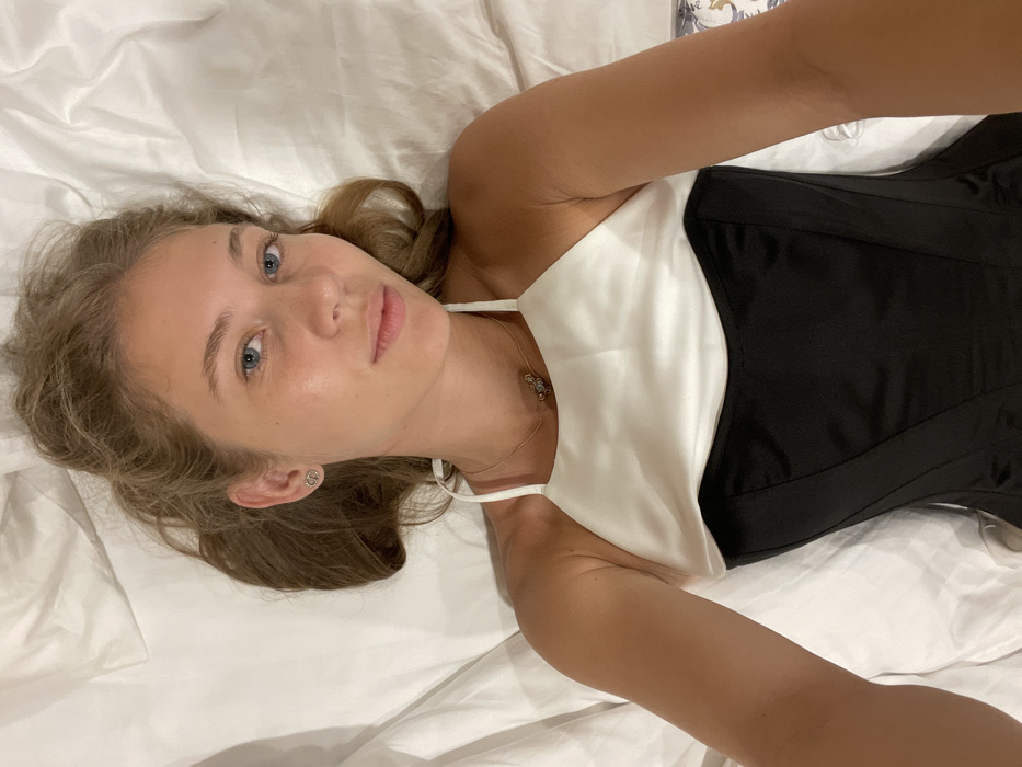 A young woman lies on a white, wrinkled bed sheet. She is wearing a black and white halter top dress. She has fair skin, light brown hair, and blue eyes. She is looking directly at the camera with a slight smile. A small silver earring is visible in her left ear. A delicate gold necklace adorns her neck. Her arms are resting on either side of her body, blending with the white bedding.