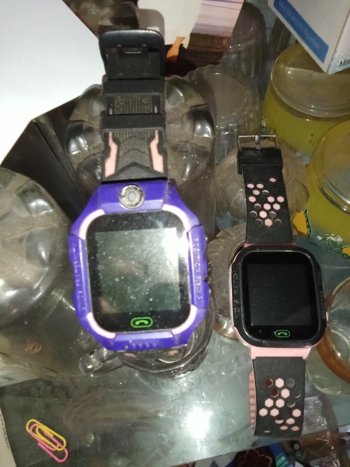 The scene is an indoor environment within the Emthanjeni Local Municipality, South Africa, featuring various objects resting on a reflective surface. Two smartwatches are the central subjects. The left smartwatch has a purple casing with a pink inner bezel, a black strap with pink accents, and a dark, dusty rectangular screen displaying a green call icon. A circular silver button is above the screen, and "T-TRITION PIX3" is embossed vertically on its right side. The right smartwatch has a black casing with a pink inner bezel and a black strap featuring hexagonal cutouts over pink material. Its rectangular screen is dark with a green call icon, and "YES WATCH" is embossed vertically on its left side. Two paper clips, one yellow and one pink, are visible in the lower-left. The background includes several translucent jars, some containing yellow/green substances, and a partially visible white and blue box labeled "Mini Bluetooth Speaker" in the upper right. The overall environment appears somewhat cluttered with uneven lighting.