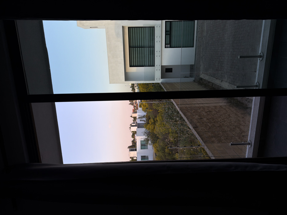 The image depicts an exterior view from an interior vantage point, looking through a sliding glass door or large window. A dark curtain partially obstructs the left side of the frame, and the window's dark frame vertically divides the scene. In the foreground, a dark floor is visible, leading to a concrete ledge with a glass railing supported by two silver posts. Beyond the railing, a textured, light brown retaining wall constructed from concrete blocks runs diagonally across the midground from left to right. Immediately behind this wall is an abundant area of dense, yellowish-green foliage, consistent with trees and shrubs. In the right midground and background, a modern, two-story white building is visible. This structure features a flat roof, large windows equipped with dark horizontal slat blinds on both levels, and a small, recessed entry on the lower level. A paved, dark grey, patterned surface, appearing to be a driveway or courtyard, occupies the ground area in front of this building. Further in the background, to the left of the prominent white building and beyond the trees, several other modern white buildings with flat roofs are discernible against the horizon. The sky above is clear, exhibiting a gradient from a light pink or lavender hue on the left to a pale blue on the right, suggesting either sunrise or sunset. The scene is located in the city of Cholula, Mexico. No individuals or animals are present in the frame.