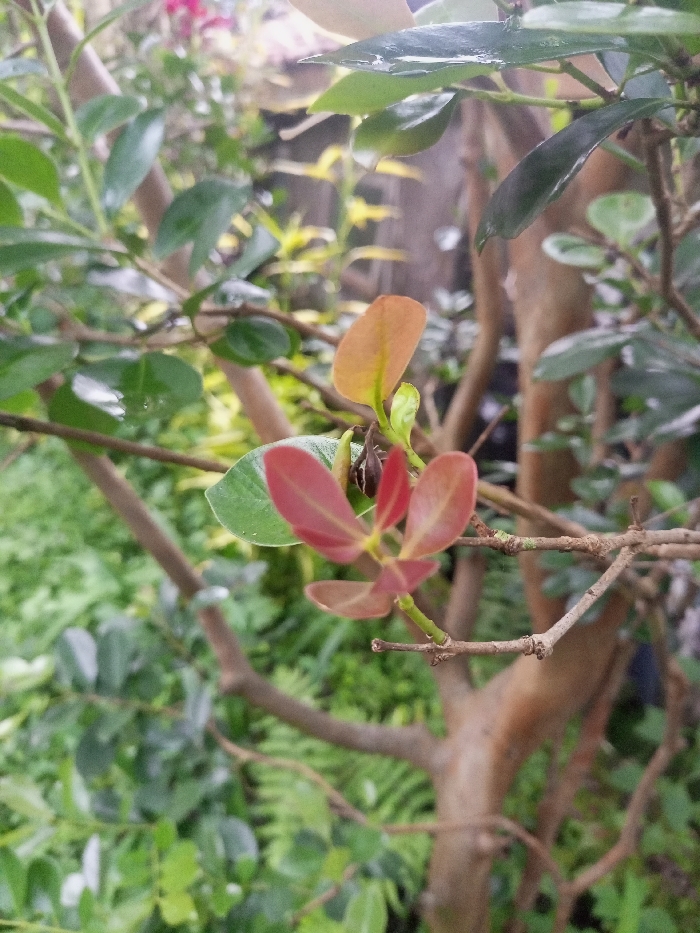 The image displays a close-up of a plant in an outdoor setting within Bamhori, India. The central focus is on a cluster of small, reddish-orange new leaves at the end of a thin, brown stem, positioned in the mid-right. Immediately behind this cluster, a single larger green leaf is visible. The plant features numerous brown, woody branches and stems, with various green leaves, some appearing wet from moisture, scattered throughout the foreground and mid-ground. The background is a soft-focus environment of dense green foliage, interspersed with lighter green or yellow-green vegetation and the muted brown tones of additional tree trunks or branches. No individuals, specific actions, or interactions are discernible.