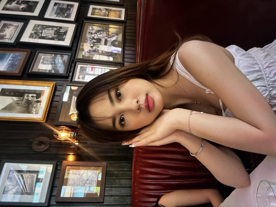 A young woman with brown hair rests her head on her hands, posing near a red upholstered booth. She wears a white top, and a delicate bracelet adorns her wrist. The background features a wood-paneled wall adorned with numerous framed pictures in black and gold frames, with a vintage-style light fixture visible among the pictures. A glass is also visible on the table.