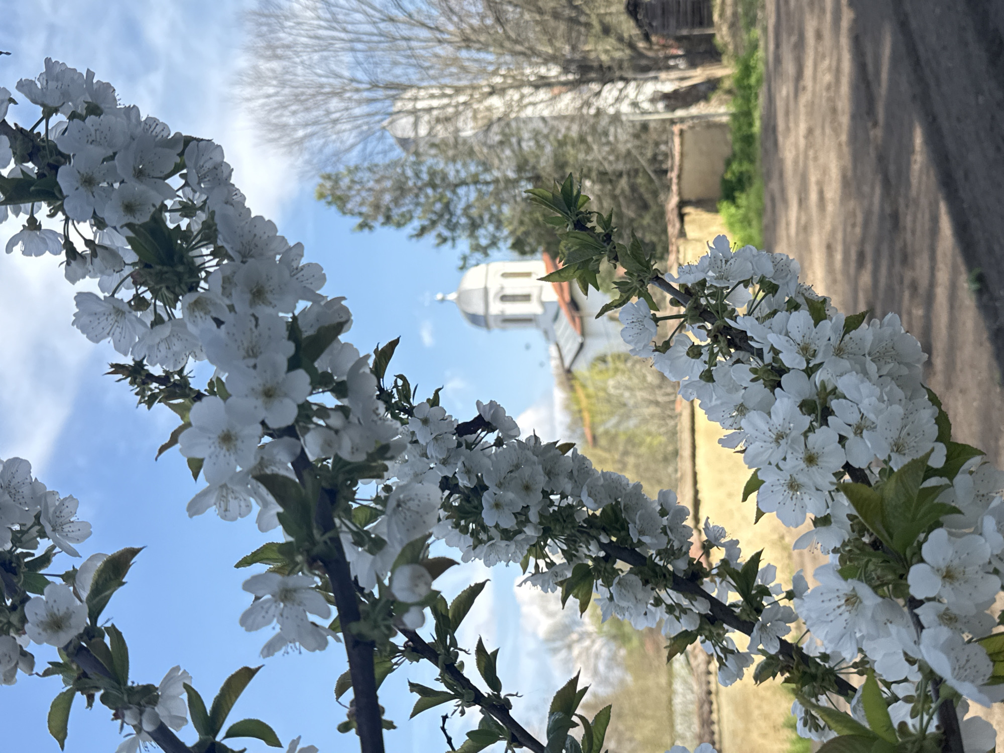 The image is an outdoor shot of white blossoms, potentially cherry or similar fruit tree blossoms, against a backdrop featuring a building with a white dome and cross at the top, likely a church or monastery
