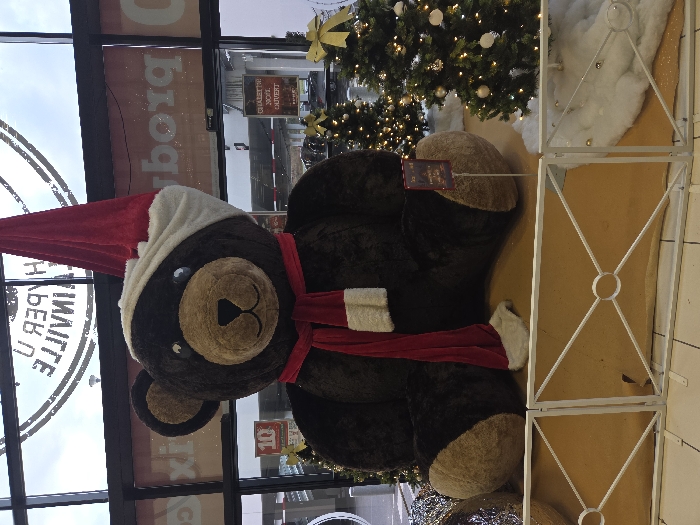 - "A large, dark brown plush teddy bear, wearing a red Santa hat with a white brim and a red scarf with white fringe, is centrally positioned in a festive display inside a commercial establishment" by FM-yER7B2, licensed under CC BY 4.0