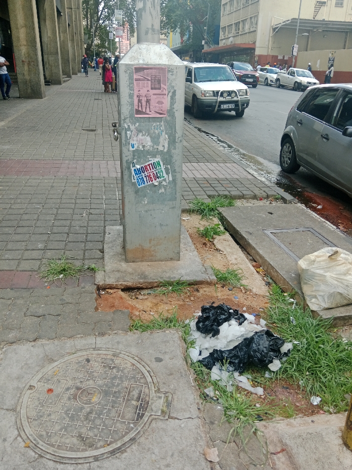 This image depicts an urban street scene in Johannesburg, Gauteng Province, South Africa, on an overcast day. In the foreground, a circular, metal manhole cover with a patterned surface is set into the concrete pavement on the lower left. To its right stands a light grey, rectangular concrete utility pillar, affixed to a raised concrete base. The pillar is heavily covered with old, torn posters and stickers. A prominent sticker near the bottom advertises "ABORTION SAFE & PAIN FREE" with a phone number "078 776 0432". Above it, a pink poster displays two male figures in uniform-like attire. A tarnished metal tap protrudes from the pillar's left side. The ground immediately surrounding the pillar and manhole cover consists of cracked concrete, exposed reddish-brown soil, and patches of green grass and weeds. To the right of the pillar, a pile of black and white plastic garbage bags and loose refuse lies on the ground amongst the weeds, adjacent to a concrete drainage channel. Further right, a single white plastic refuse bag rests on the edge of the concrete drainage structure. The paved sidewalk, constructed from interlocking grey bricks with occasional red accents, shows signs of wear, unevenness, and cracks. In the midground, the sidewalk extends under a colonnaded walkway formed by robust, fluted concrete pillars of a multi-story building on the left. Several pedestrians are present on the sidewalk; one individual in a white t-shirt and blue jeans is visible on the far left, while a group, including a person in a red dress, stands further down. Parallel to the sidewalk, an asphalt road features two visible lanes. A white SUV, possibly a Nissan Sani or similar model, equipped with a front bull bar and auxiliary lights, is either parked or slowly moving near the curb. Its license plate, "EJSG 97 GP," confirms its registration in Gauteng Province. To its right, a silver-grey hatchback (resembling a Ford Fiesta) is parked parallel to the curb, with its rear tire and a reddish-brown liquid stain on the wet curb area visible. Other vehicles, including a red car, are visible further along the road. The background shows more multi-story urban buildings, with discernible windows and balconies, extending into the distance. Green foliage and trees are visible above the structures. The sky is uniformly bright, indicating an overcast condition.