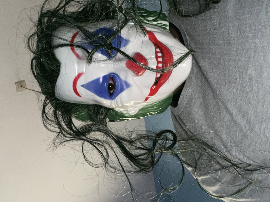An upward-angled indoor photograph depicts a person wearing a white plastic mask designed to resemble a clown or the Joker, complete with green, tousled synthetic hair