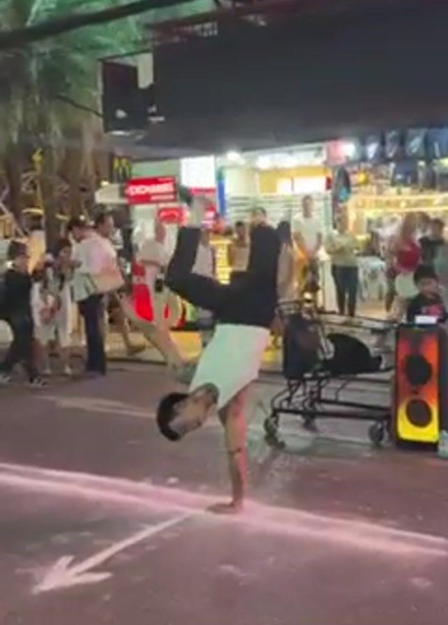 A young male breakdancer is performing on a street at night. He is wearing a white tank top and black pants. He is balancing on one hand and spinning his body in a circle. There are people watching him, and a speaker playing music nearby. The street is marked with a white arrow, and there are shops and palm trees in the background. The area is well-lit, with streetlights and the bright lights from the shops and a big digital display sign.