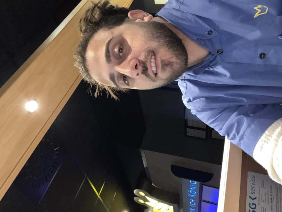 A man with dark hair and a beard wears a blue button-down shirt. He is angled towards the camera with a slight smile. Part of his white sweater is visible. Behind him is a dimly lit interior with an overhead light and a structural beam. A sign with "ich KÖNIG" in blue letters is visible, as well as a service information sticker. A circular design is on the wall, and the background shows a modern architectural structure.