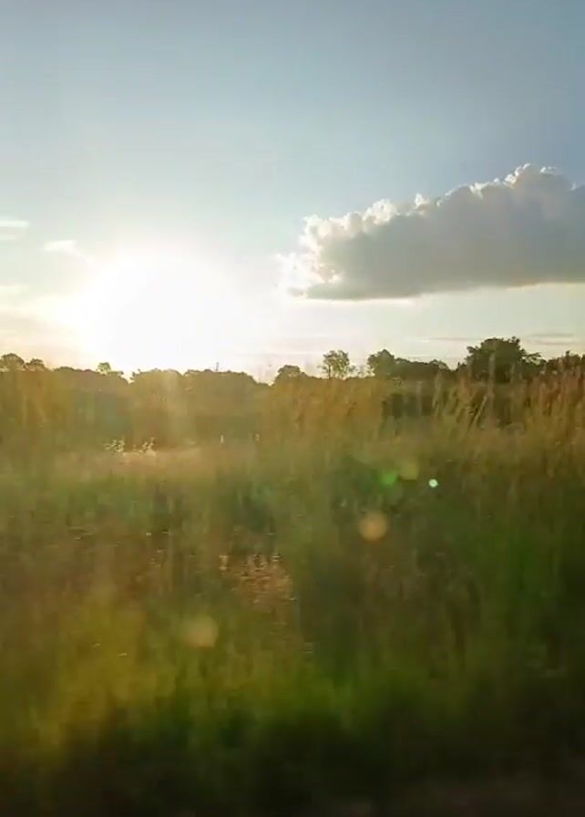 rural scene viewed from a moving vehicle, likely a car or truck. The time of day appears to be late afternoon or early evening, based on the low angle of the sun and the warm, golden light. The landscape consists of a field of tall, golden grass, interspersed with trees and bushes along the horizon. A road runs parallel to the vehicle's path. As the vehicle progresses, a white truck passes in the opposite direction. The sky is bright blue with scattered clouds. A bird flies overhead. The overall impression is one of a peaceful, sunny day in the countryside.