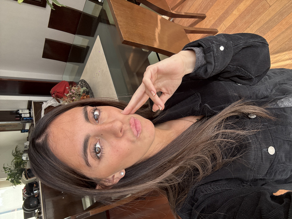 A young woman with long brown hair poses close to the camera with a playful expression. She touches her cheek with her hand, displaying neatly manicured nails. Her jacket appears to be made of corduroy. The background features a modern interior with chairs and a table visible. A shelf with objects is seen at the far left of the frame.
