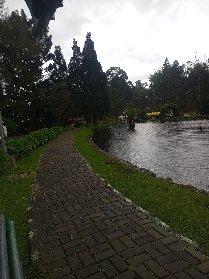 - "A park landscape features a brick path curving along a still body of water, possibly a pond or lake" by FM-KXM8D3, licensed under CC BY 4.0