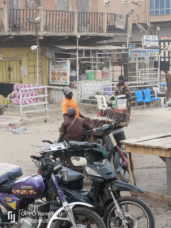 A street scene displays buildings in the background. Two motorbikes are parked in the foreground, with one being purple with a "SUZUKI" logo. A small gathering of people surrounds a vendor selling goods on a wooden cart. A man in an orange shirt and cap appears to be attending to a customer. Other vendors and customers are also present. Signs for "SUYA SPOT VIP SPECIAL" and "DANGASKE SUYA SPOR WIP SPEFIAL" can be seen on the vendor stalls.