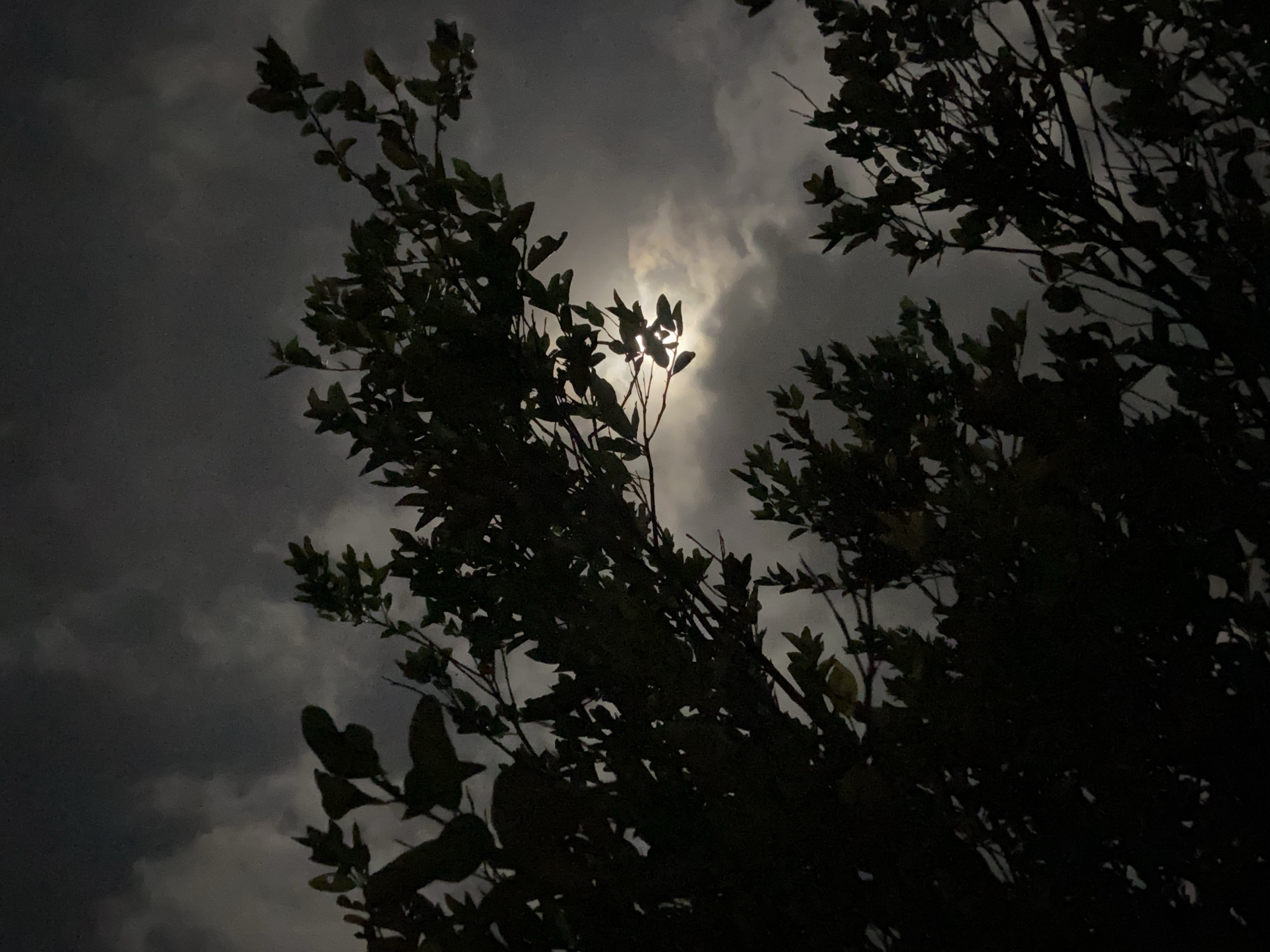 trees silhouetted against a cloudy night sky