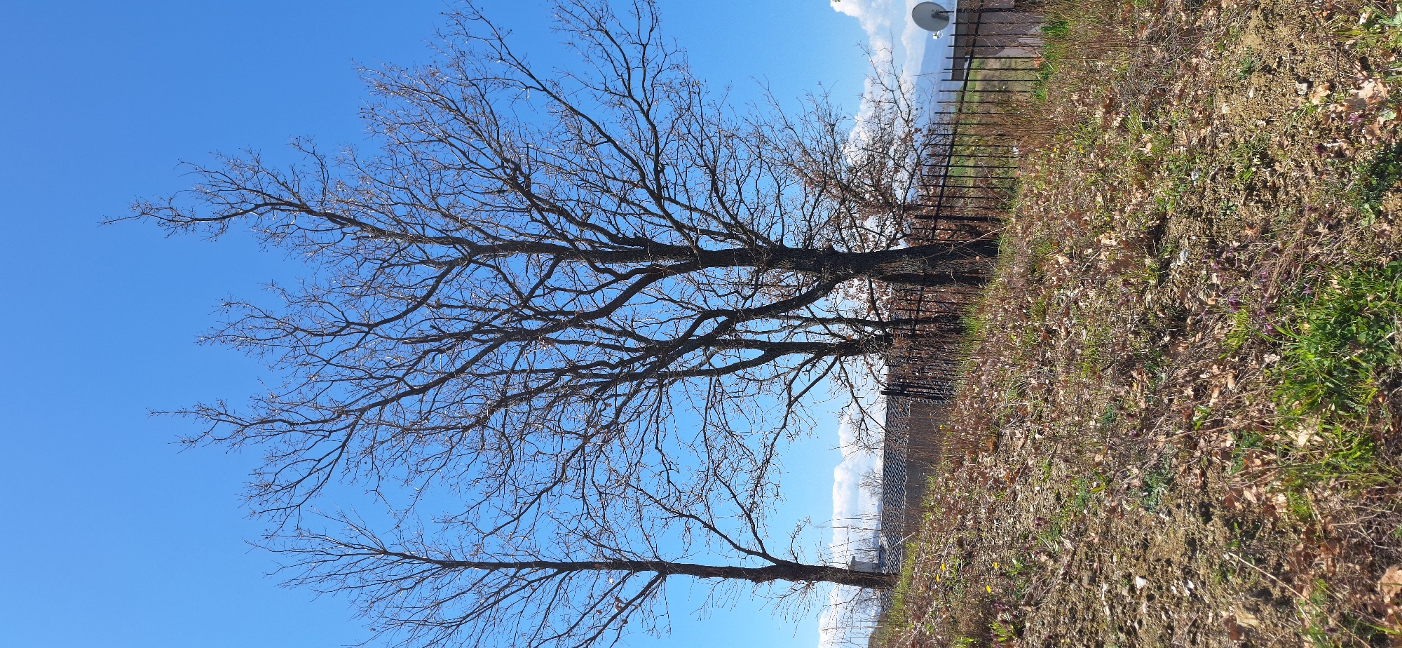 The image depicts a winter scene in Marulevo, Bulgaria. The focus is on two bare deciduous trees silhouetted against a clear blue sky. A satellite dish is visible in the upper right corner. The foreground is dominated by dry, brown vegetation with patches of green grass, suggesting a transition from winter to early spring. A dark, metal fence runs along the edge of the vegetation. The scene lacks any visible human presence or activity.