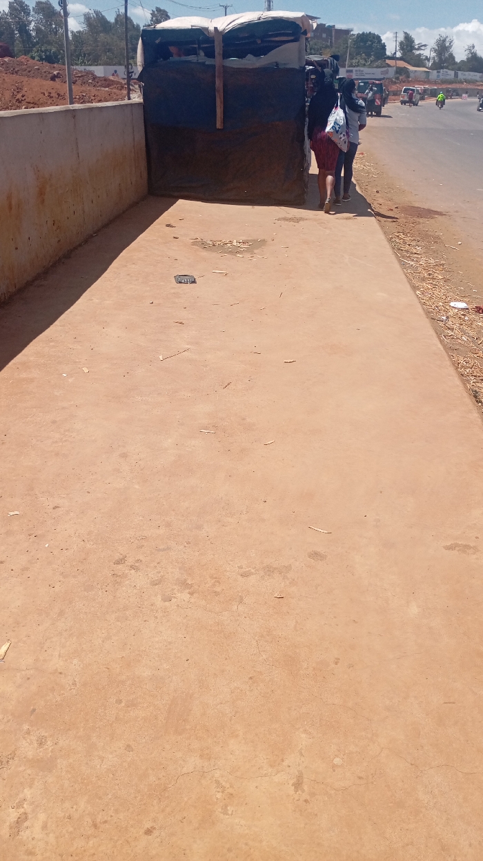 A long, tan concrete sidewalk is visible, running parallel to a road with sparse traffic and a concrete wall. A makeshift shelter, framed with wooden posts and draped with dark material, stands on the sidewalk, partially blocking the view of three people walking. Debris, possibly wood shavings, scatters the sidewalk surface. The sky is partially cloudy, and the general environment appears to be a developing area.