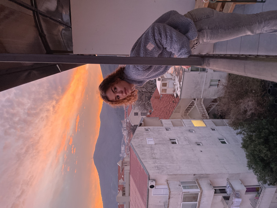 The scene captures a woman leaning on a balcony railing in Budva, Montenegro, at sunset. The individual, an adult female with curly brown hair, light skin, and a neutral expression, occupies the right foreground. She wears a light gray fleece jacket and light-colored jeans, and her gaze is directed towards the camera. Her forearms rest on a dark metal balcony railing. The immediate environment includes the partial view of a structural column and an overhead section of the balcony. Beyond the balcony, the urban landscape of Budva unfolds under a vibrant sunset. Multi-story buildings with light-colored facades and distinct red-tiled roofs dominate the mid-ground. Specific details include an external air conditioning unit on a building to the left, laundry hanging on a lower balcony of the same structure, and visible external staircases on several buildings. One window in a central building glows with a bright yellow light. Sparse vegetation, including leafless trees and bushes, is present between structures. The horizon is defined by a large, dark mountain featuring a faint structure at its peak. The sky exhibits dramatic orange, pink, and yellow hues, streaked with clouds, consistent with a clear sunset.