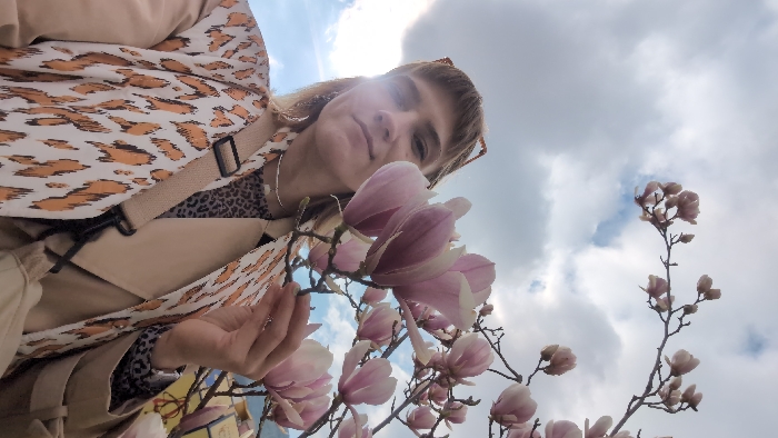 An adult female is depicted in a selfie-style photograph taken outdoors in Budva, Montenegro. She has light brown hair with bangs and brown-framed sunglasses resting on top of her head. Her expression is neutral, and she looks directly into the camera. She is wearing a leopard-print top, a beige trench coat, and a white scarf with an orange/brown abstract animal print. A thin silver necklace is visible, and a beige strap, likely from a bag, crosses her torso. Her right hand holds a branch densely covered with pink and white magnolia flowers and buds, positioned prominently in the foreground and midground. The sky behind her is partly cloudy with patches of blue visible. A bright light source, consistent with the sun, is located in the upper left of the frame, causing a lens flare effect. Indistinct background elements, possibly urban structures, are minimally visible to the lower right. The presence of blooming magnolias indicates a springtime setting.