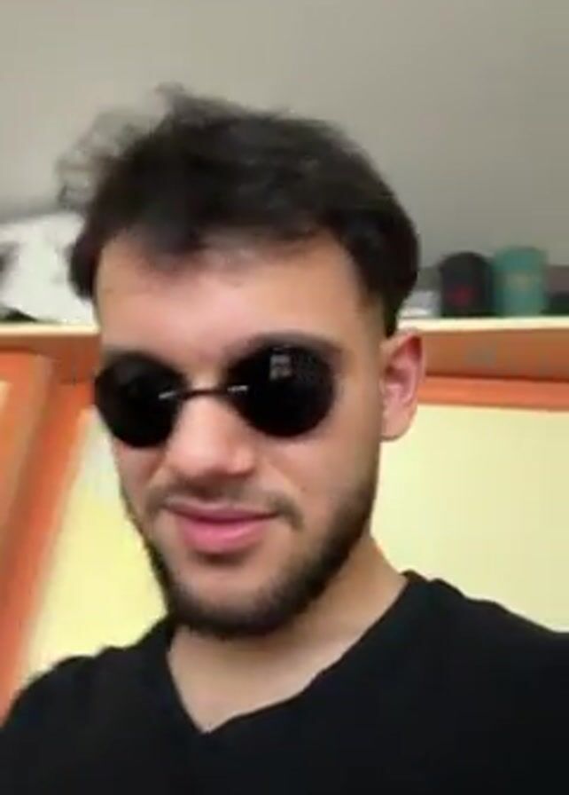 A young man with dark hair and a short beard is centered in the frame