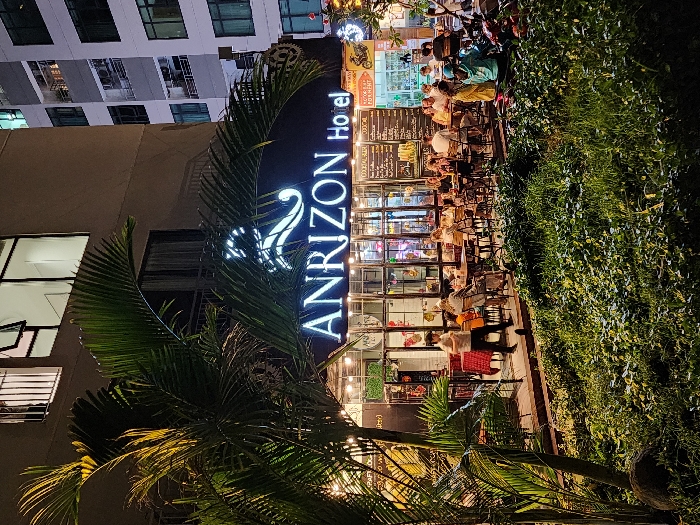 The image displays a nighttime urban street scene in Nha Trang, Vietnam, centered on the ANRIZON Hotel. The hotel's prominent, illuminated sign, featuring a stylized wave graphic and the words "ANRIZON Hotel," is visible above a glass-fronted establishment. In the immediate foreground, dense green foliage and palm trees occupy the lower and left portions of the frame. Beyond this greenery, an outdoor dining area is active, furnished with multiple tables and chairs. Approximately 20-30 individuals are observed seated, standing, or walking within this area, engaged in dining and social interaction under artificial lighting, including string lights. Menu boards are affixed to the building's facade. To the right, a red scooter is parked, with two individuals seated upon it. The background reveals additional multi-story buildings with illuminated windows, indicative of a city environment.