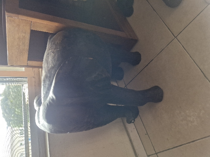 A dark, mottled object resembling a statue of an animal, possibly a dog or bull, is positioned on a tiled floor next to a wooden table or shelf. The object's head is near a window. The tile pattern on the floor is visible, as is the texture of the wooden furniture. The entire image is slightly blurry, with a high-angle, close-up perspective.