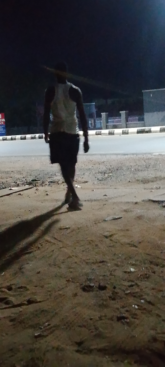 This image, captured at night in Zango-ndaji, Nigeria, displays a solitary male figure walking away from the viewer on an unpaved, dirt surface. The individual is dressed in a light-colored tank top and dark shorts, with a prominent shadow cast to the viewer's right. Adjacent to the dirt foreground is a paved road, demarcated by a black and white striped curb. In the background, across the road, various structures are visible, including a dark building on the right, a lighter-colored fence with pillars, and a blurred sign exhibiting red and blue components on the far left. The scene is characterized by low ambient lighting, consistent with nocturnal conditions. A horizontal light streak crosses the upper back area of the subject.
