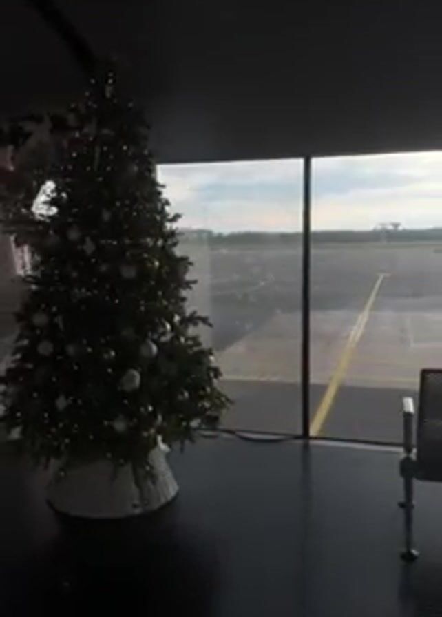 The scene is an airport terminal during the Christmas season. A decorated Christmas tree stands near a large window overlooking the airport runway. The tree is adorned with lights and silver ornaments and sits in a white wicker base. To the left of the tree, there is a white floral arrangement and a decorated wreath hanging on the wall. A metal bench sits to the right of the window. Outside, the runway is visible under a cloudy sky.