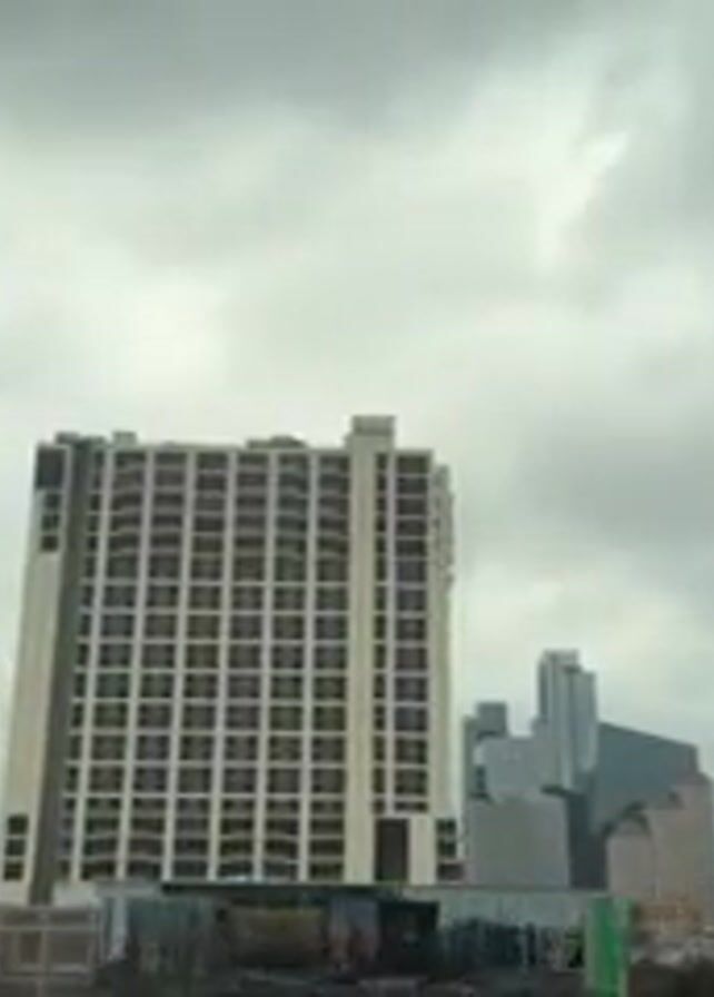 cityscape under a cloudy sky, likely taken from a moving vehicle. Several tall buildings with numerous windows are visible, including a uniquely shaped structure resembling a pyramid. Highway infrastructure, such as a large metal support structure and streetlights, intermittently appear in the foreground, momentarily obstructing the view of the skyline. A red truck briefly passes in the lower right corner of the frame.