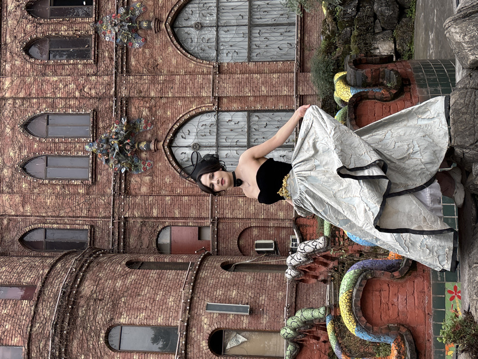 A lone female subject is centrally positioned in a full-length outdoor shot, standing on dark, uneven rocky ground in front of an ornate brick building in Baqiao, China. The woman wears a black strapless top, a gold-colored ornate belt, a voluminous light-colored skirt with a textured pattern and dark trim, a black choker necklace with a small pendant, and a black fascinator. Her left hand is raised, holding a portion of her skirt, and she faces the viewer directly. The background is dominated by a multi-story building constructed of reddish-brown brick, extensively covered with dried vines. It features numerous arched windows, some with decorative ironwork grilles, and two prominent, multi-colored ornamental sculptures affixed to the facade between the upper windows. A rounded turret section is visible on the left side of the building. In the mid-ground, behind and to the left of the subject, a low red brick structure is visible, adorned with undulating, multi-colored mosaic tiles resembling abstract serpentine forms. White footwear is partially visible beneath the subject's skirt. Air conditioning units are affixed to the brick wall on the left side of the building.