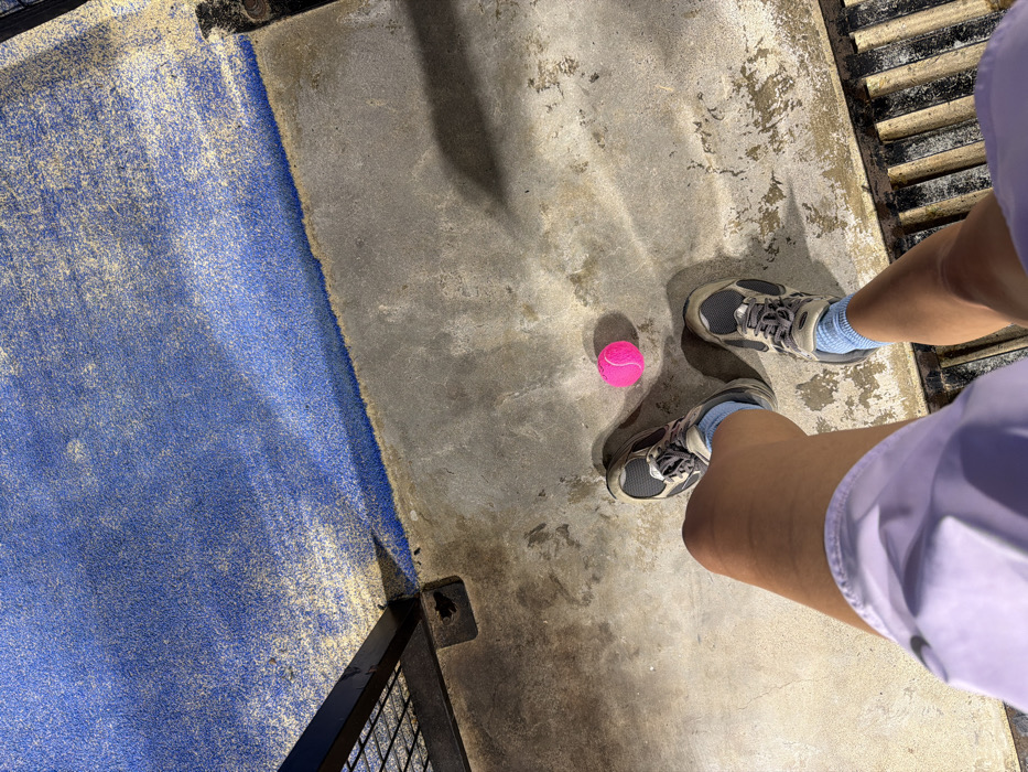 The scene depicts a first-person, downward view of a person's lower body standing on a concrete surface adjacent to a blue sports court in Pecatu, Indonesia. The individual wears light purple athletic shorts, grey and beige athletic shoes, and light blue socks. A single, bright pink ball rests on the concrete between their feet. To the upper left, a black metal post with a grid-like structure, possibly part of a fence or net support, is visible, casting a shadow. The concrete ground exhibits variations in tone and texture, consistent with wear and moisture. A metal grate, possibly for drainage, runs along the bottom edge of the frame. The blue sports court, visible in the upper portion, has a textured surface with scattered lighter particles.