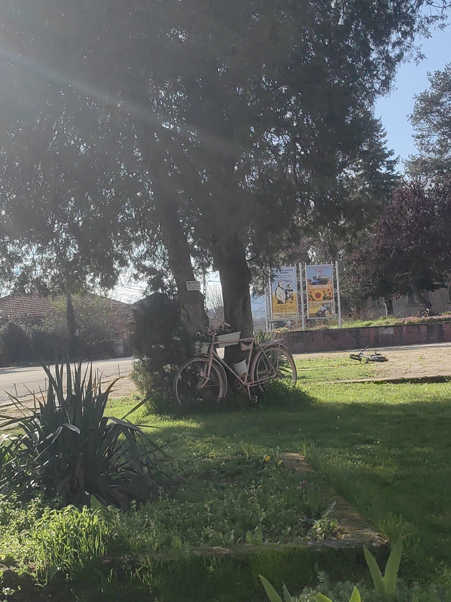 The image depicts a tranquil scene in Sennik, Bulgaria. A pink bicycle, adorned with a planter, stands near a tree, partially obscured by foliage. Two posters are visible in the background, along with a section of a building. The foreground consists of grass and various plants. Sunlight filters through the trees, creating a bright atmosphere.