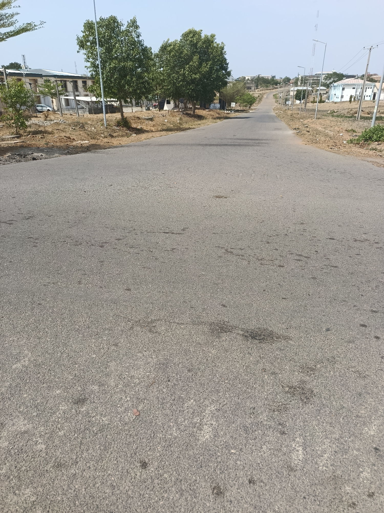 The image depicts a paved road stretching into the distance in what appears to be a suburban or rural area in Unknown, Nigeria