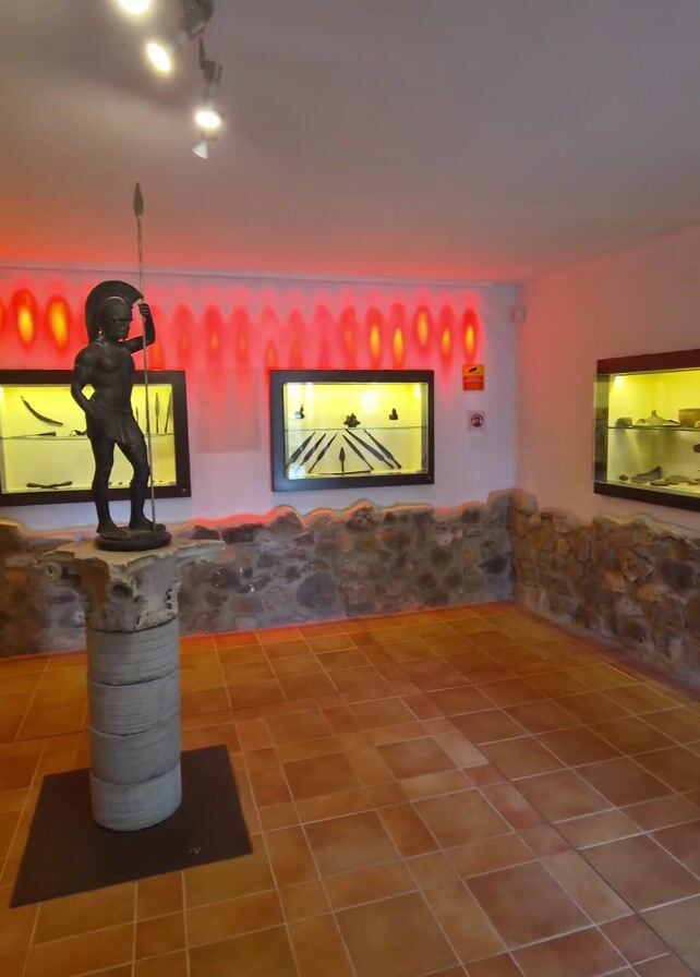 interior of a room that appears to be a museum or historical exhibit. The room has terracotta-colored tile flooring and white walls, with a section along the bottom made of rough, uneven stones. Display cases containing artifacts line the stone section of the wall, illuminated by yellow lights. Above the display cases, a row of red, oval-shaped lights creates a distinctive visual element. In the center of the room, a statue of a Greek warrior stands atop a column. An ornate lamp hangs from the ceiling in the middle of the room. In one corner, there is a staircase leading to another level, and a painting hangs on the wall beside it. The overall impression is that of a space dedicated to showcasing historical artifacts and information.
