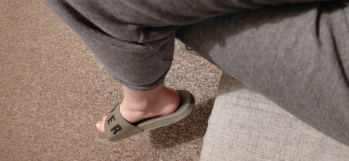 The image presents a close-up, high-angle view focused on a human leg and foot. The specific location within the city of Ilion, Greece, cannot be ascertained from the visual evidence provided. The subject is an individual wearing dark grey sweatpants, indicated by the fabric covering the lower leg. A single foot, with light skin tone, is partially inserted into an olive-green slide sandal. Black lettering, specifically "ER", is visible on the sandal's strap. The heel of the foot is slightly elevated from the sandal's sole, suggesting a relaxed or partially disengaged position. The leg is bent, indicating the individual is likely seated or reclining. The immediate environment consists of a light brown, low-pile carpet. A section of light grey, textured fabric, possibly upholstery from a chair or couch, is visible in the lower-left foreground. No other individuals or distinguishing objects are present.
