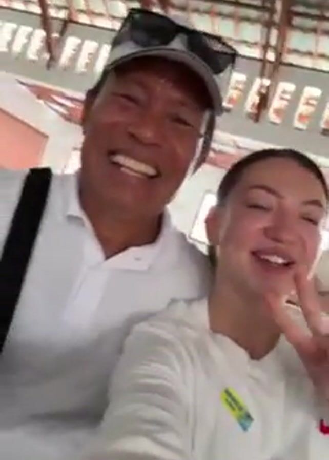 In a selfie-style video, a man and a woman are smiling at the camera. The man, who is older, is wearing a white polo shirt, a white cap with sunglasses perched on top, and a black bag slung over his shoulder. The woman is wearing a white long-sleeved shirt with a small emblem on the front and a red Nike swoosh on the sleeve. The camera is held slightly above eye level, capturing both their faces and a portion of the background, which seems to be an indoor structure with a tiled roof and open walls. Throughout the video, both individuals gesture with their hands. The woman makes a peace sign and gives a thumbs-up, while the man offers a thumbs-up as well. They appear to be interacting in a friendly manner.