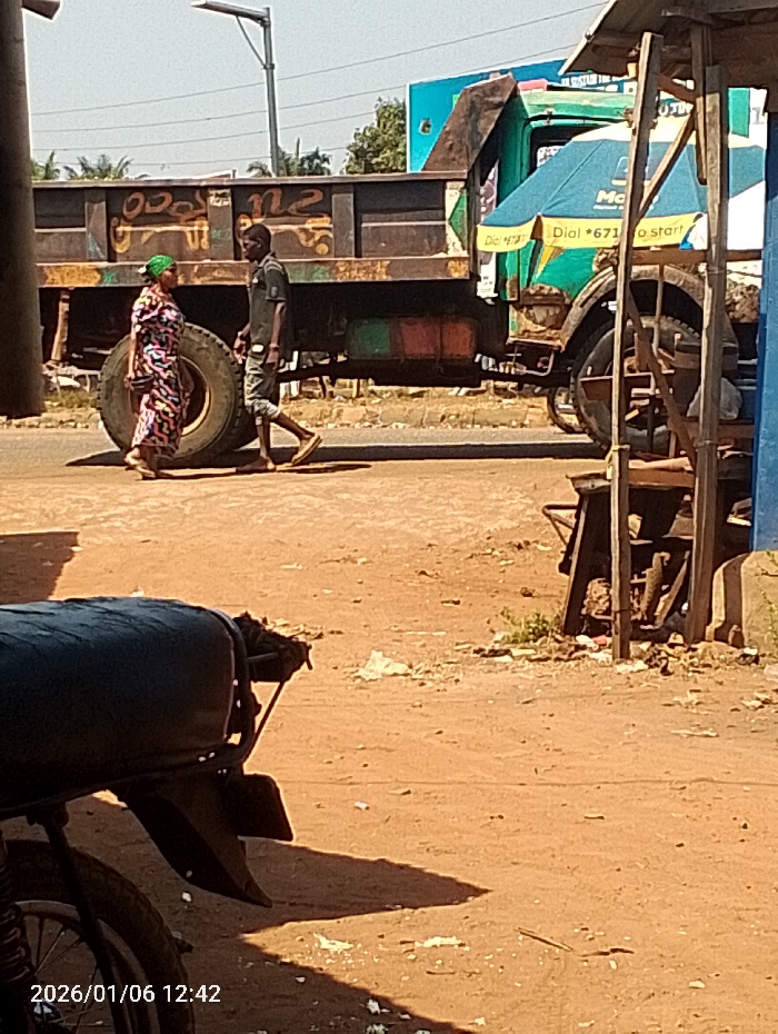 A man and woman walk near a large truck with a green cab and brown bed. The truck has large tires and is parked on a dirt road. A blue and white advertisement umbrella is visible beside the truck cab. The foreground features a black motorcycle. The scene appears to be in a rural or developing area with dirt and litter visible on the ground. A street lamp is visible in the background.