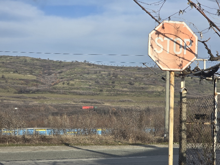 The scene depicts a rural landscape near Djerman, Bulgaria, under a partly cloudy sky. In the immediate foreground, a weathered, faded octagonal STOP sign with white lettering is mounted on a light-colored pole. Shadows from bare, thorny branches or wires are cast across the sign. To the right of the sign, a section of a chain-link fence is visible. The bottom of the image shows a gray asphalt road surface. Beyond the road, a strip of dense, dormant brush and small trees extends across the midground. Partially obscured by this vegetation is a long, low structure with blue and yellow sections. Further in the midground, a red object, possibly a truck or container, is visible amidst the dry foliage. The background features rolling hills covered in sparse, dry, terraced vegetation, indicating a non-growing season. No individuals are present, and no specific actions or interactions are depicted.