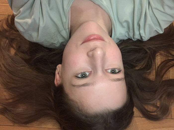 A woman with long brown hair sprawls horizontally, facing the camera with her head at the bottom. Her eyes are light green. She wears a pale green top. She lies on a light brown wooden floor.